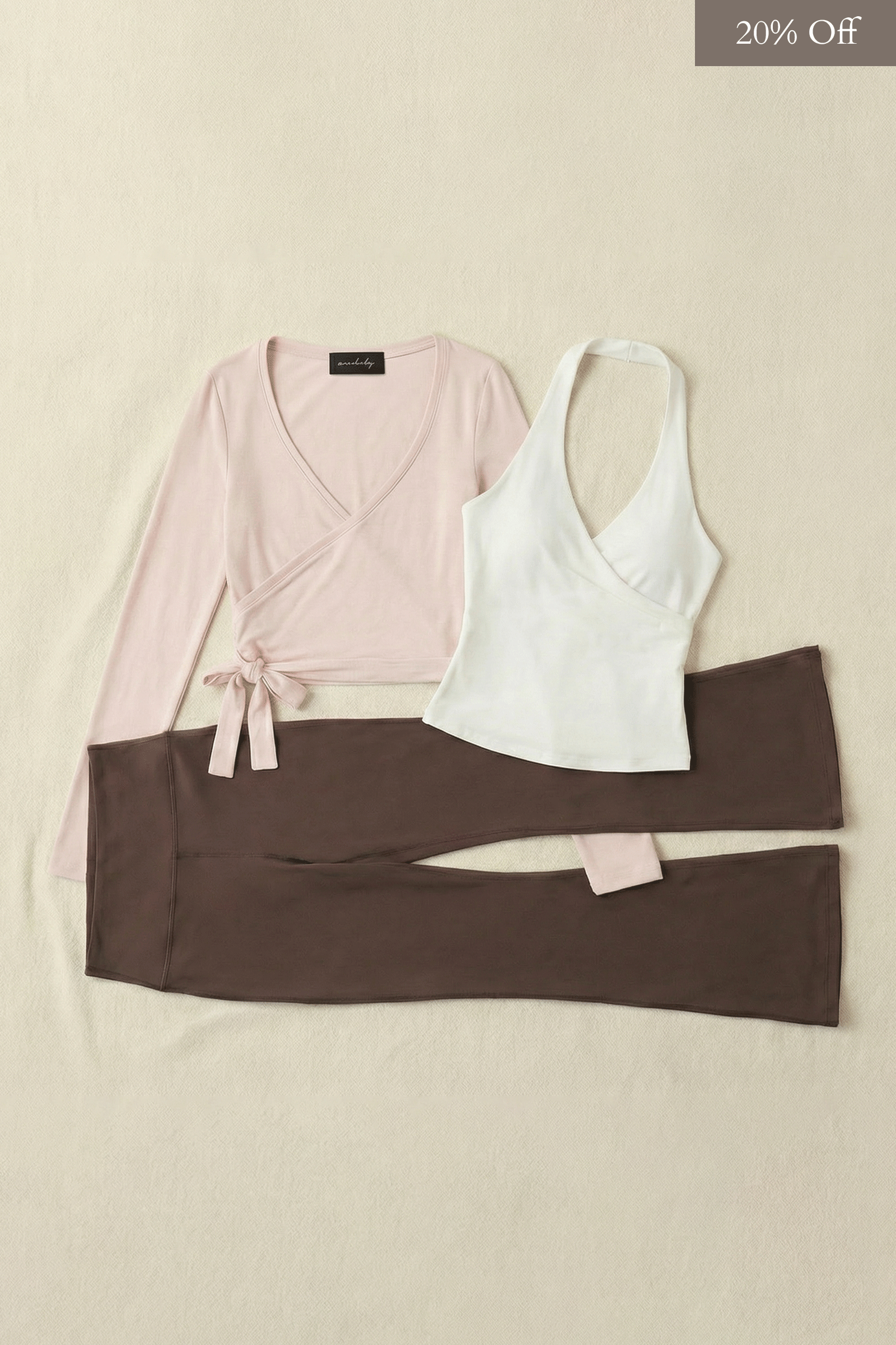 Discover a curated harmony of style, support, and flow. The DOLLY Set brings together three bestselling essentials—the iconic DOLLY Wrap Top, the sculpting TAYLOR Bra Top, and the sleek SOL Bootcut Leggings. Designed to move seamlessly from mindful movement to daily life, this trio offers a complete outfit of understated elegance and intelligent comfort.