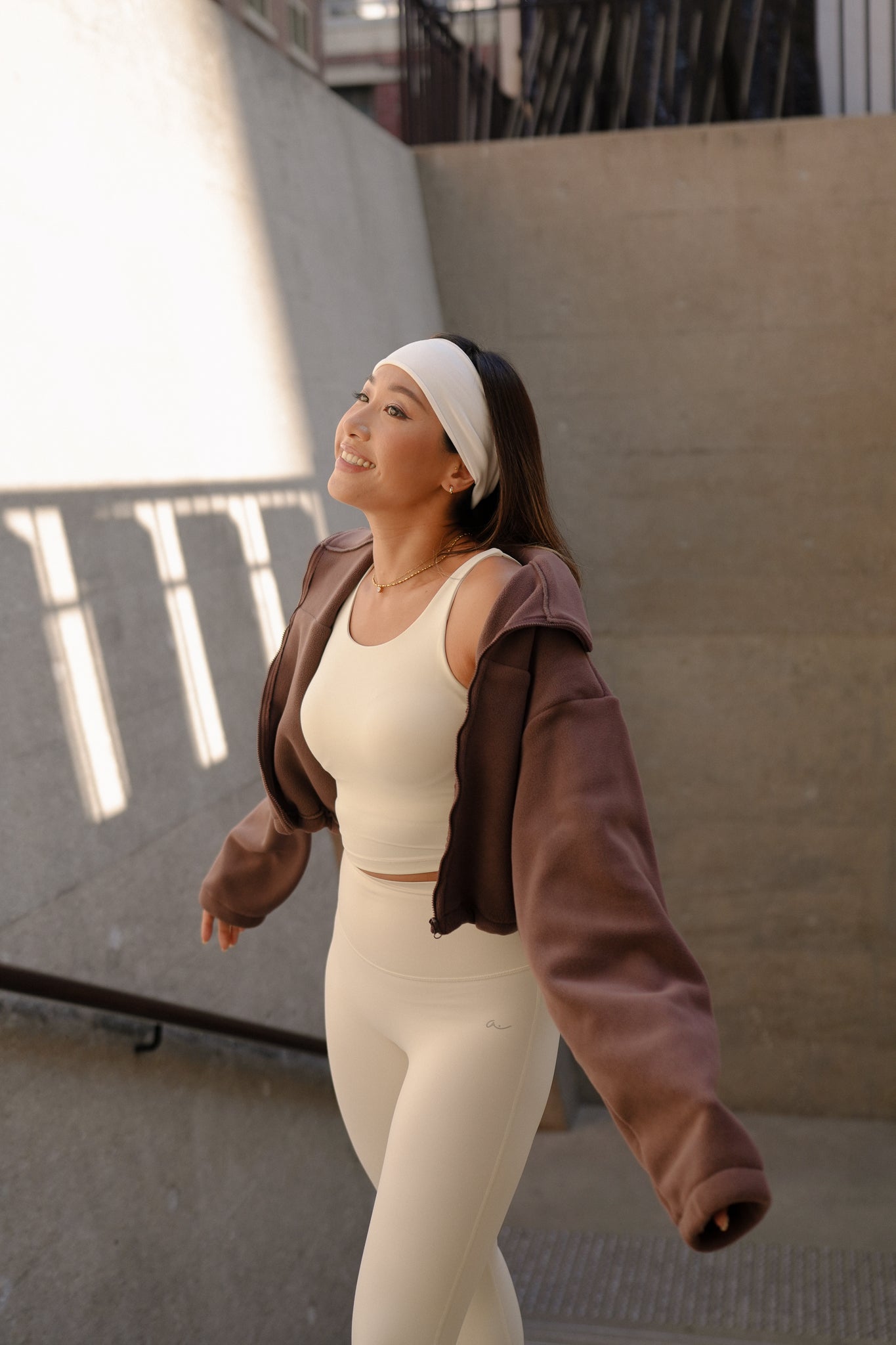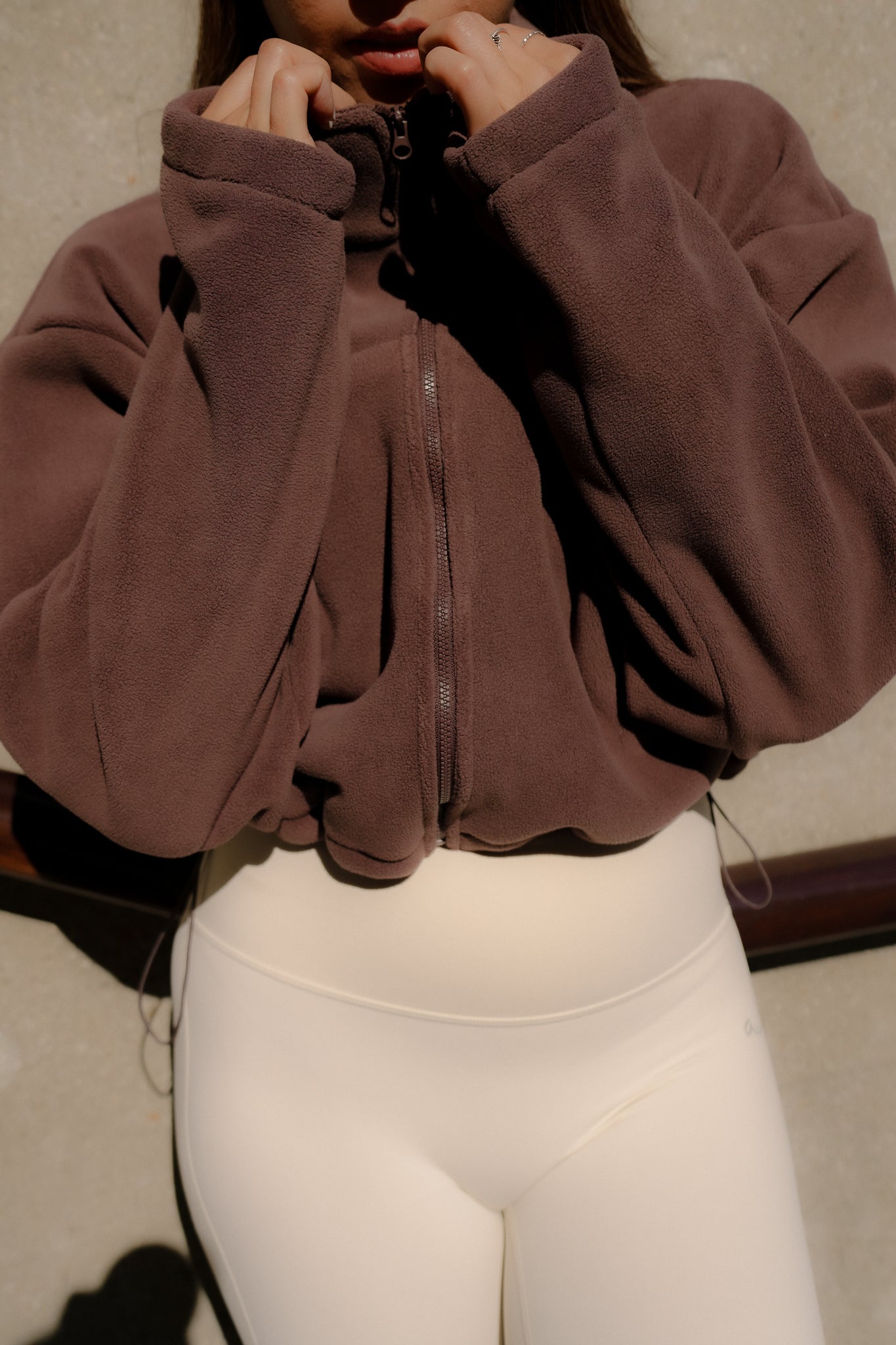 With its relaxed, oversized fit and thoughtful details—like a sleek high collar, zip-front closure, and adjustable bungee hem—it layers effortlessly over everything from post-pilates sets to weekend loungewear. Raglan sleeves ensure unrestricted movement, whether you're on a crisp morning walk or grabbing a coffee on-the-go.