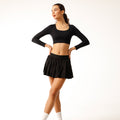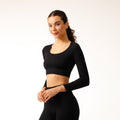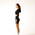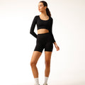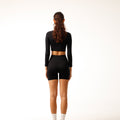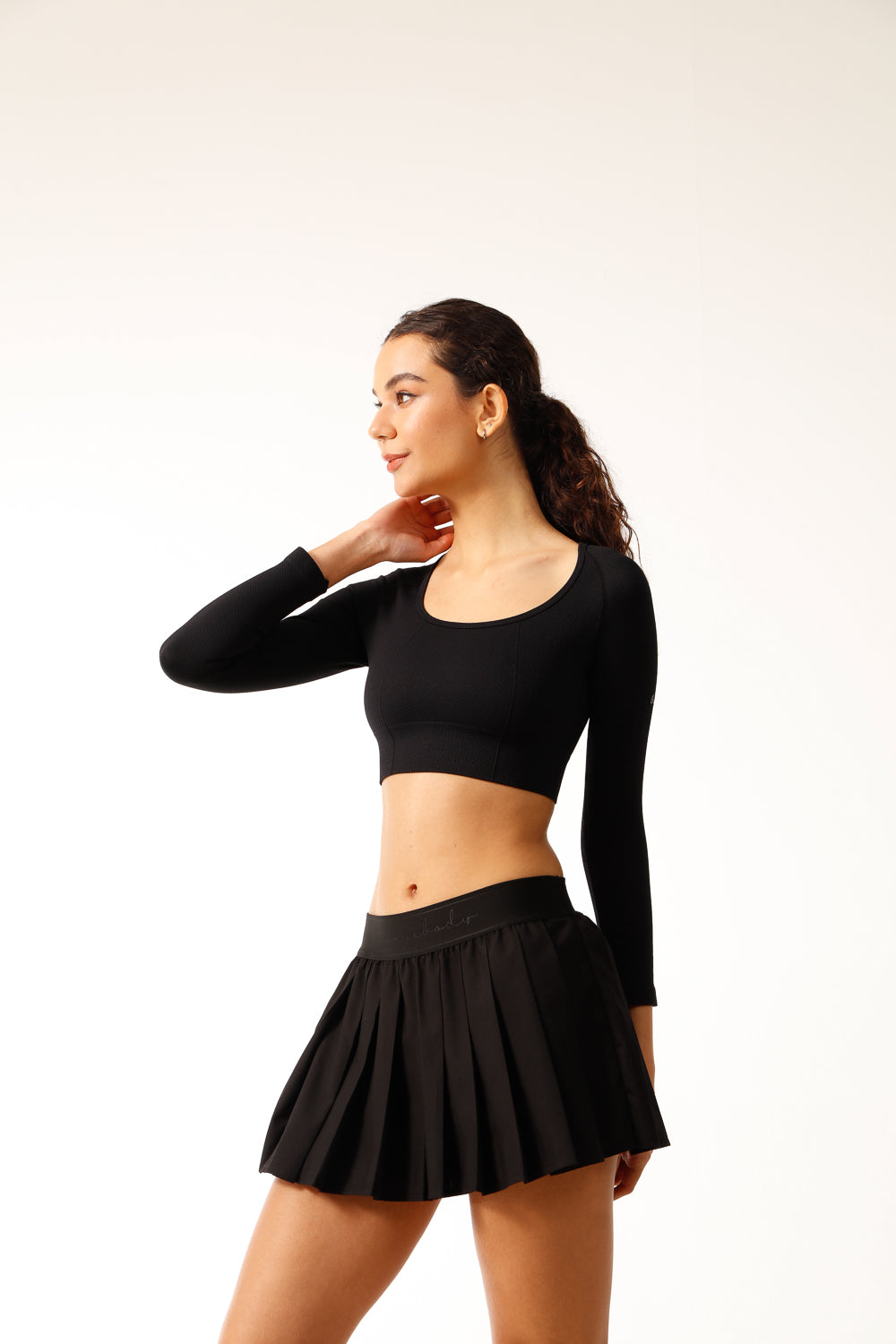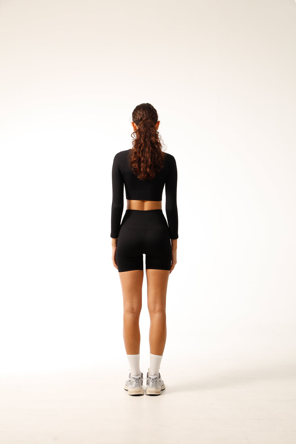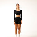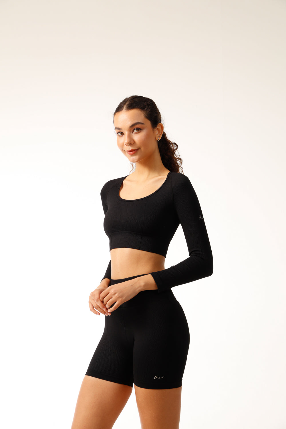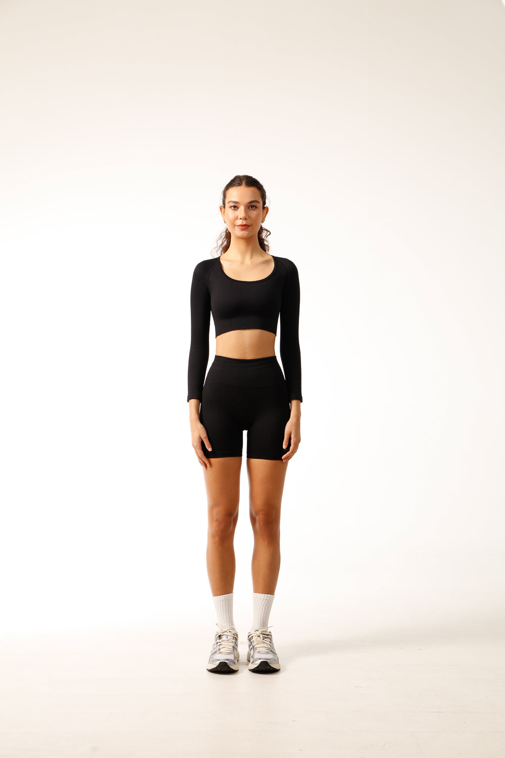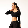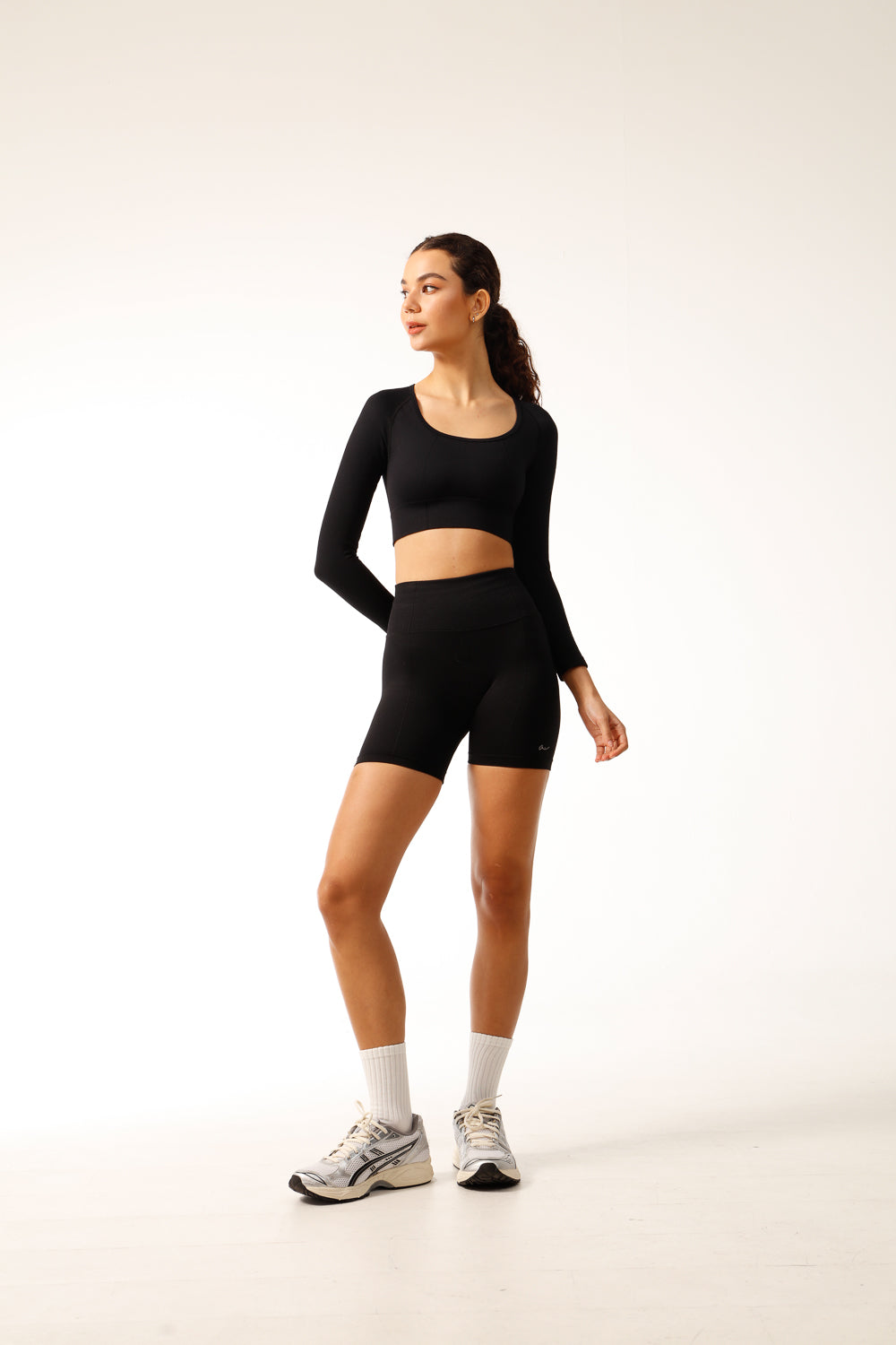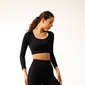 The TERRA Crop Top redefines layering with architectural precision. Designed for the woman who moves from studio sessions to street style, its deep scoop neckline, forward-curved hem, and 7/8 sleeves strike the perfect balance between minimalist edge and functional elegance.