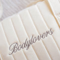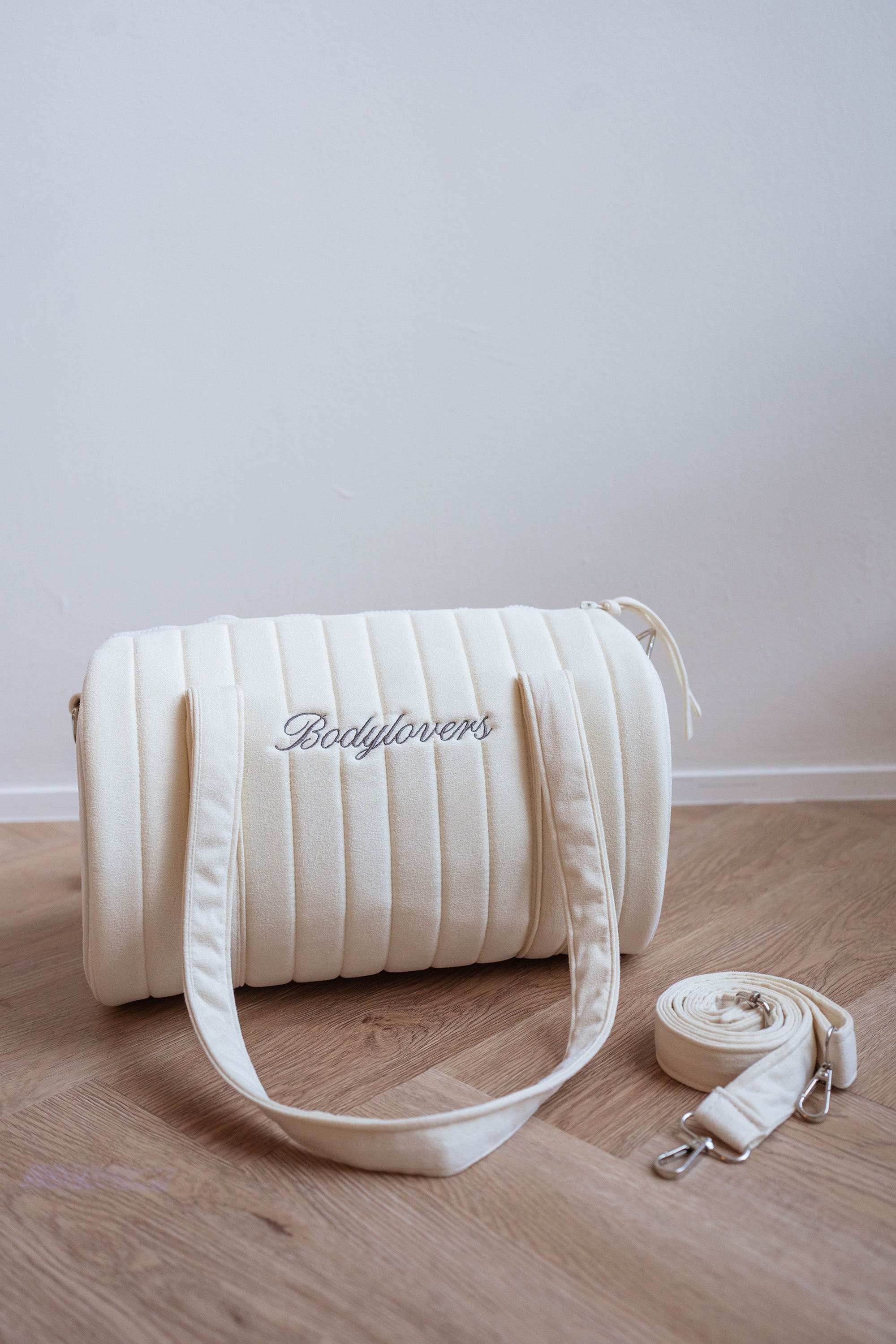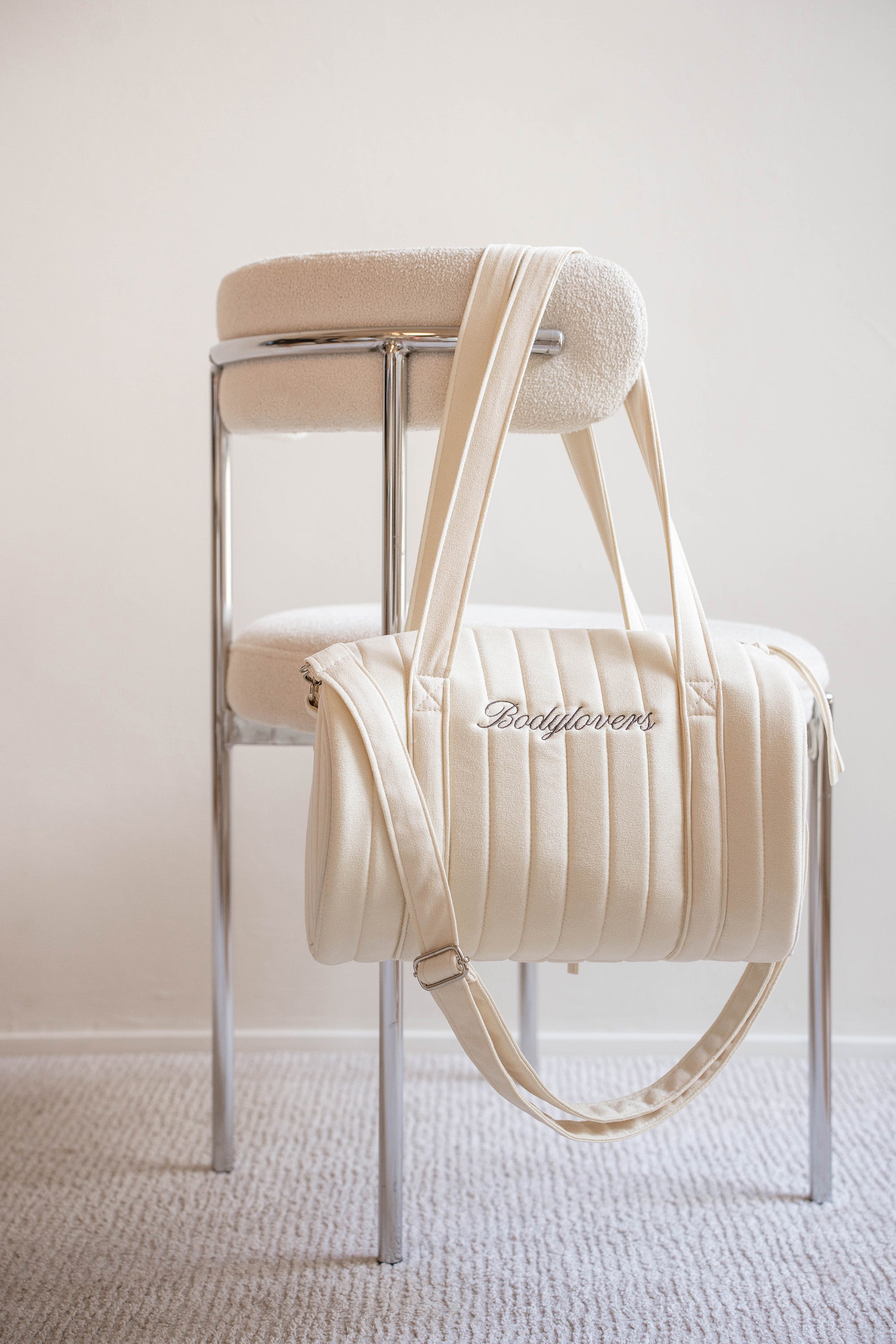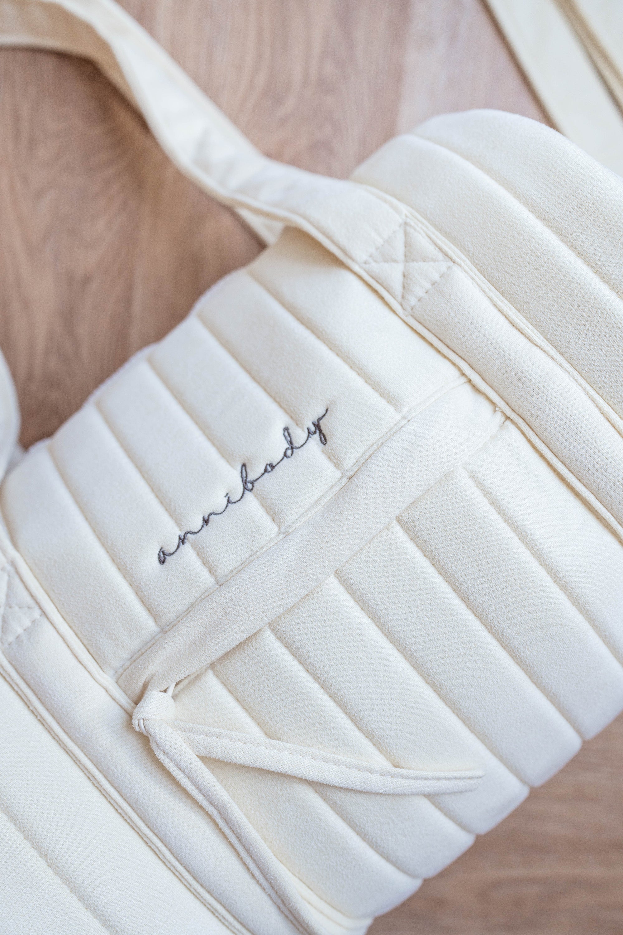 以天鵝絨柔霧質感包裹每一次出發。燙金拉鍊與「annibody bodylovers」灰褐刺繡相映,從健身室到異國街角,優雅收納生活多重角色。