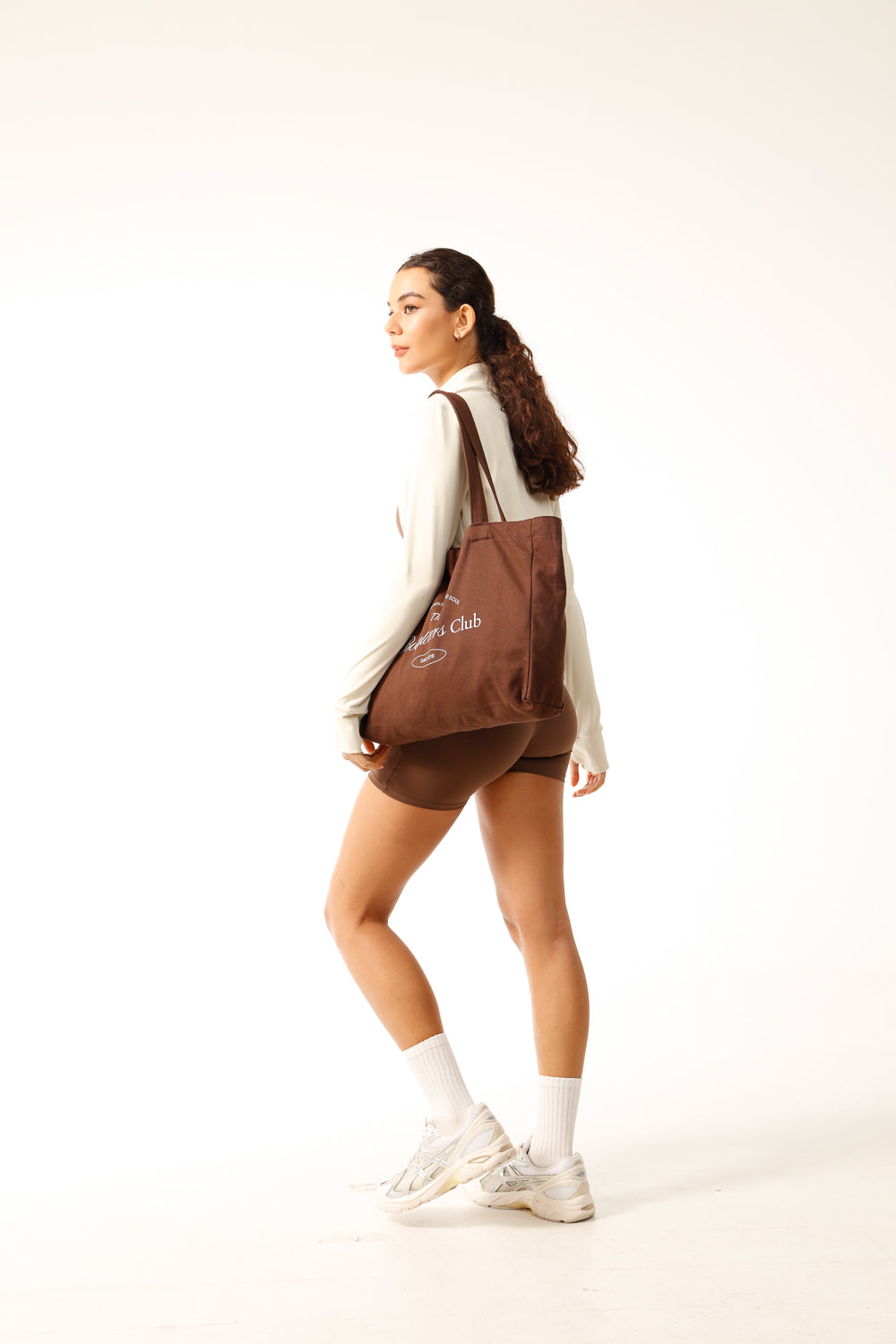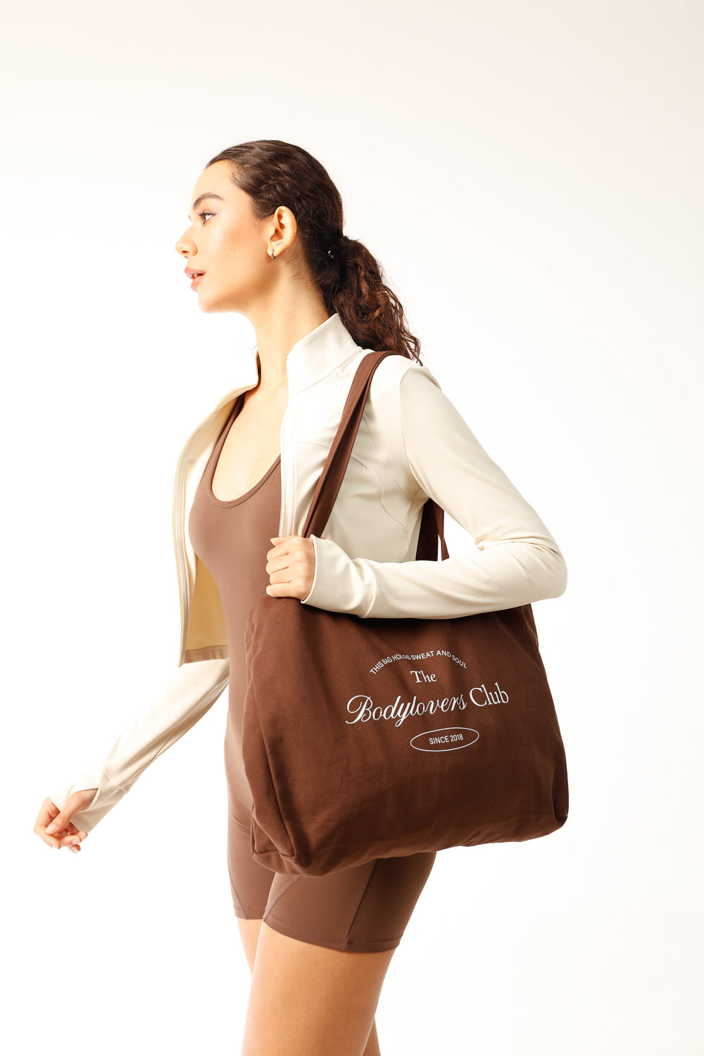迎接您的新日常必需品—Bodylovers Club Tote。這款包採用堅固的棉質帆布製成,顏色為濃鬱的濃縮摩卡色,既實用又具有像徵意義,融合了簡約的設計,大膽宣示了我們社區所代表的價值觀:力量、汗水和靈魂。